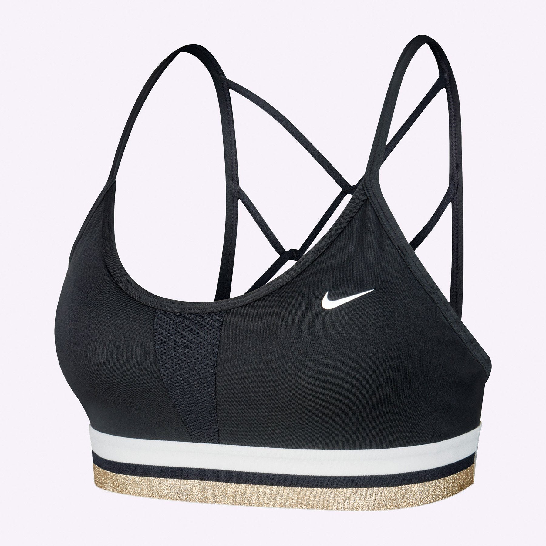 The Nike Indy Sports Bra has a strappy design inspired by a nothing-but-net attitude from the basketball court. The shimmering chest band is all about classic hoops style.